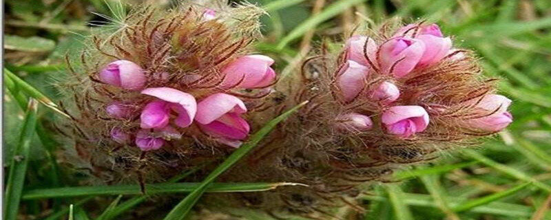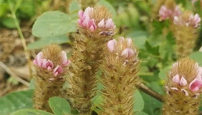 多年生草本,茎平卧或开展,高度在60公分以下,花枝直立或斜升。叶多数为3小叶复叶,兼有单小叶,小叶片纸质,顶生小叶近圆形或卵形,长2-6公分,侧生小叶比较小,叶柄长1-2公分。总状花序顶生,长3-6公分,直径2公分左右,花朵排列紧密,苞片宽卵形,密生灰色毛及缘毛,花萼5裂,上部2裂片三角形,下部3裂片刺毛状,花冠浅紫色,荚果小,包在花萼里面,有荚节1-2个,黑褐色,膨胀,无毛,8-10月开花结果。