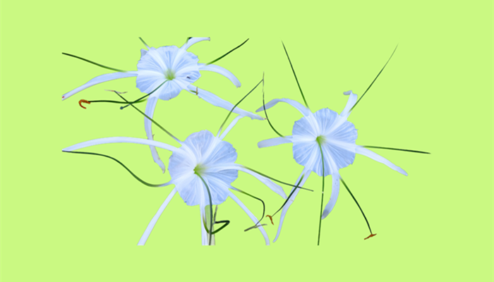 水鬼蕉的花瓣一般是细长的,且分的很开,酷似蜘蛛的长腿,而花朵中间的部分则可被看作是蜘蛛的身体,细长的花瓣在顶端会有向下弯曲的趋势。
