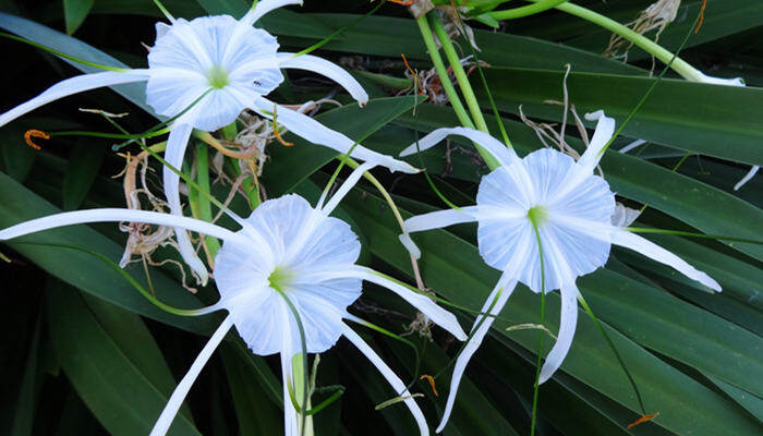 水鬼蕉叶姿健美,花期6-7月,花白色,花朵一般比较大,花瓣厚而覆盖着蜡质,一般为黄绿色到黄色,并分布着一些褐色或紫褐色的斑点。